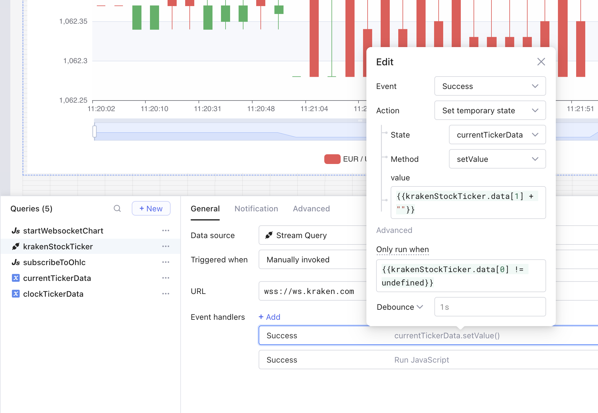 We use the "Success" trigger of the Stream Query and set a Temporary State with the value. In the special case of Kraken Websocket, we want to skip all "heartbeat messages", so we only set Temporary State, if there are payload data in the current message.