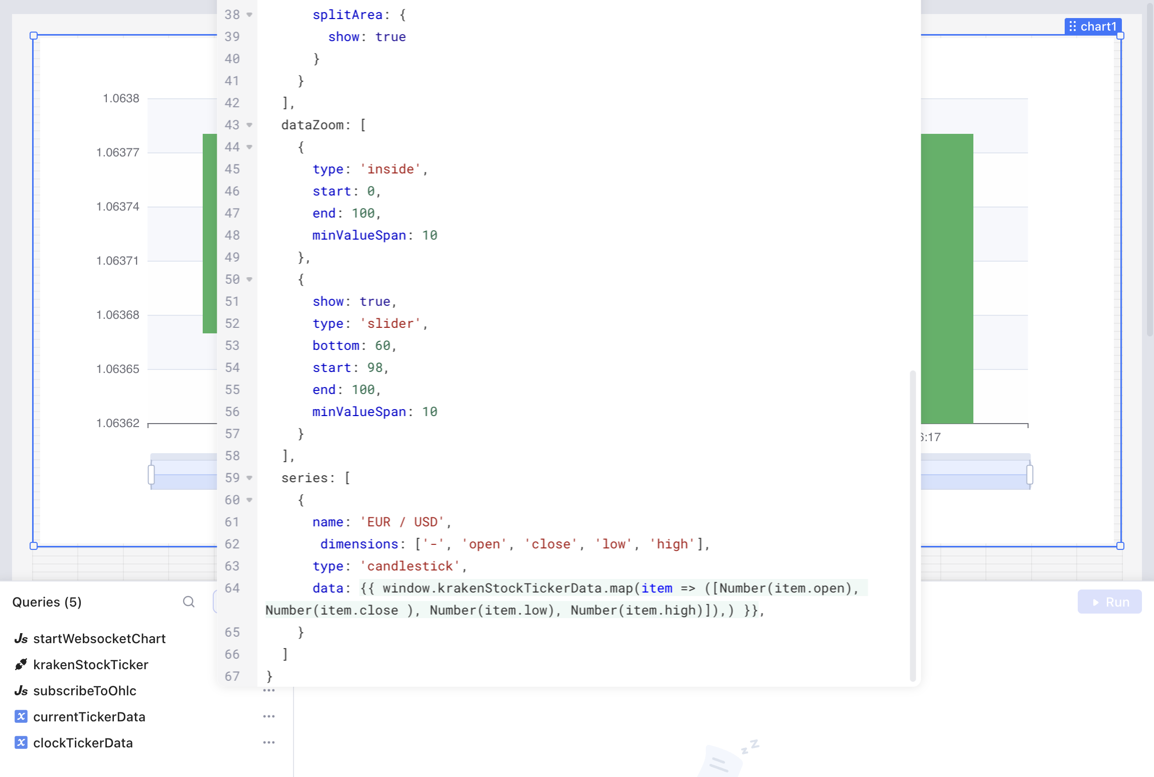 Now we can bind a Javascript processing for each incoming message to the "Success" Trigger of the Stream Query and bind our chart to this data-array.