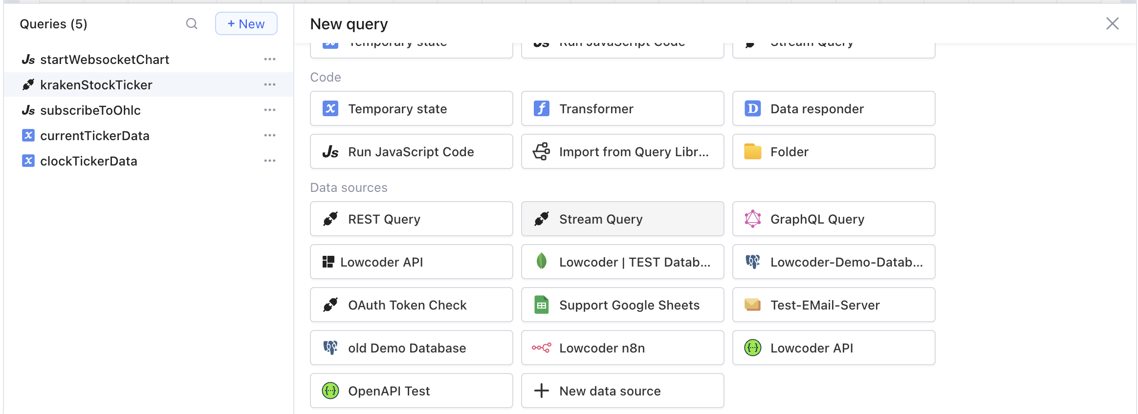First, select "Stream Query" as a new Query from the available Datasources. Stream Query is available from OpenFlower v2.1.0.